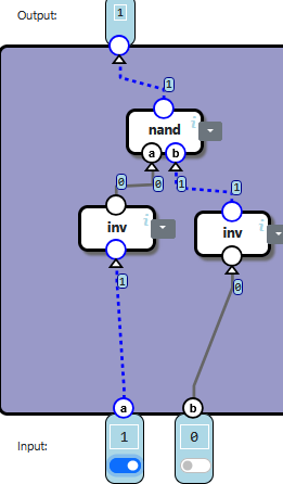-On connecte la sortie de la première porte sur A ET aussi sur B de la 2e porte NAND. Donc, quand la première porte n'enverra rien, la 2e porte sera OUVERTE. Si la première porte envoie quelque chose (cas où A seul est activé ou bien B seul, ou bien rien), alors la 2e porte sera fermée.